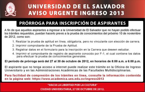 A fin de que aquellos aspirantes a ingresar a la Universidad de El Salvador que no hayan podido efectuar los trámites requeridos, puedan hacerlos previo a la prueba de conocimientos del próximo 10 de Noviembre de 2012, como son: