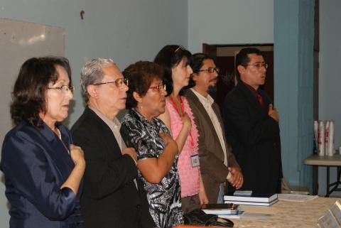 La mesa de honor fue conformada por la Maestra Ana María Glower de Alvarado, Vicerrectora académica, Lic. José Raymundo Calderón Morán, Decano de la Facultad de Ciencias y Humanidades; Licda. Norma Cecilia Blandón de Castro, Vicedecana; Dr. José Luís Escamilla, jefe del Departamento de Letras; Ing. Carolina Magaña, administradora académica de humanidades y Lic. Carlos Morales, coordinador de Bibliotecología.