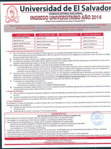 La Universidad de El Salvador convocó a personas interesadas a ingresar a estudiar en esta univesidad pública para el año 2014.